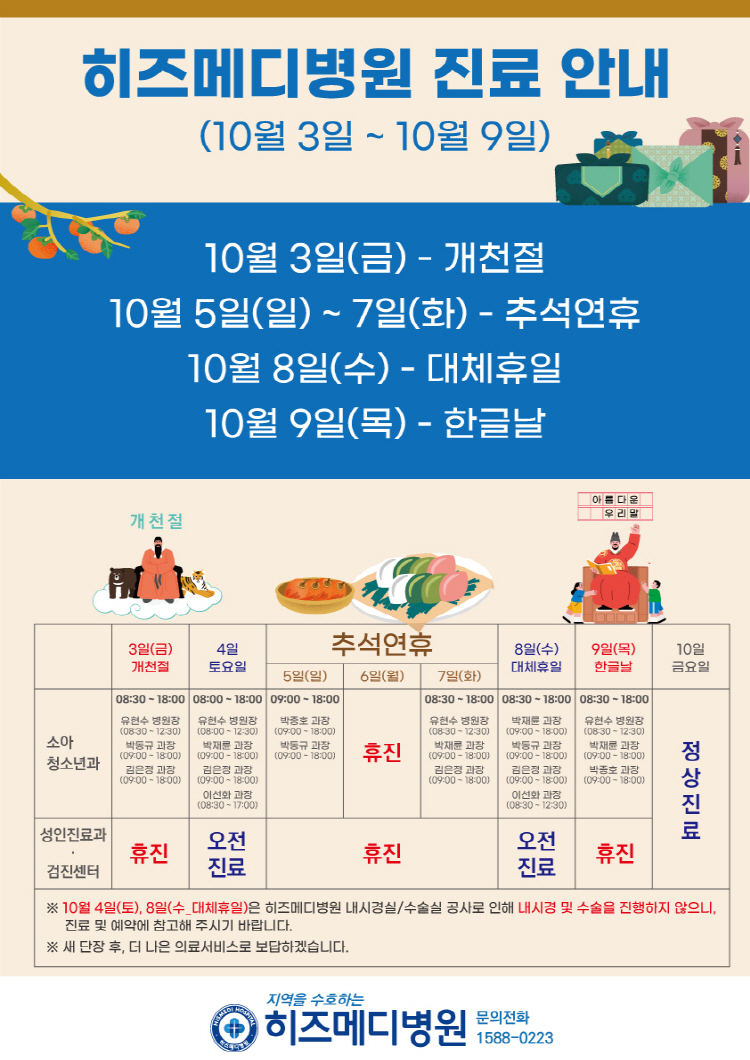 COPYRIGHT © 2018 히즈메디병원. All Rights Reserved.| [진료안내] 2025 개천절, 추석연휴, 대체휴일, 한글날 |