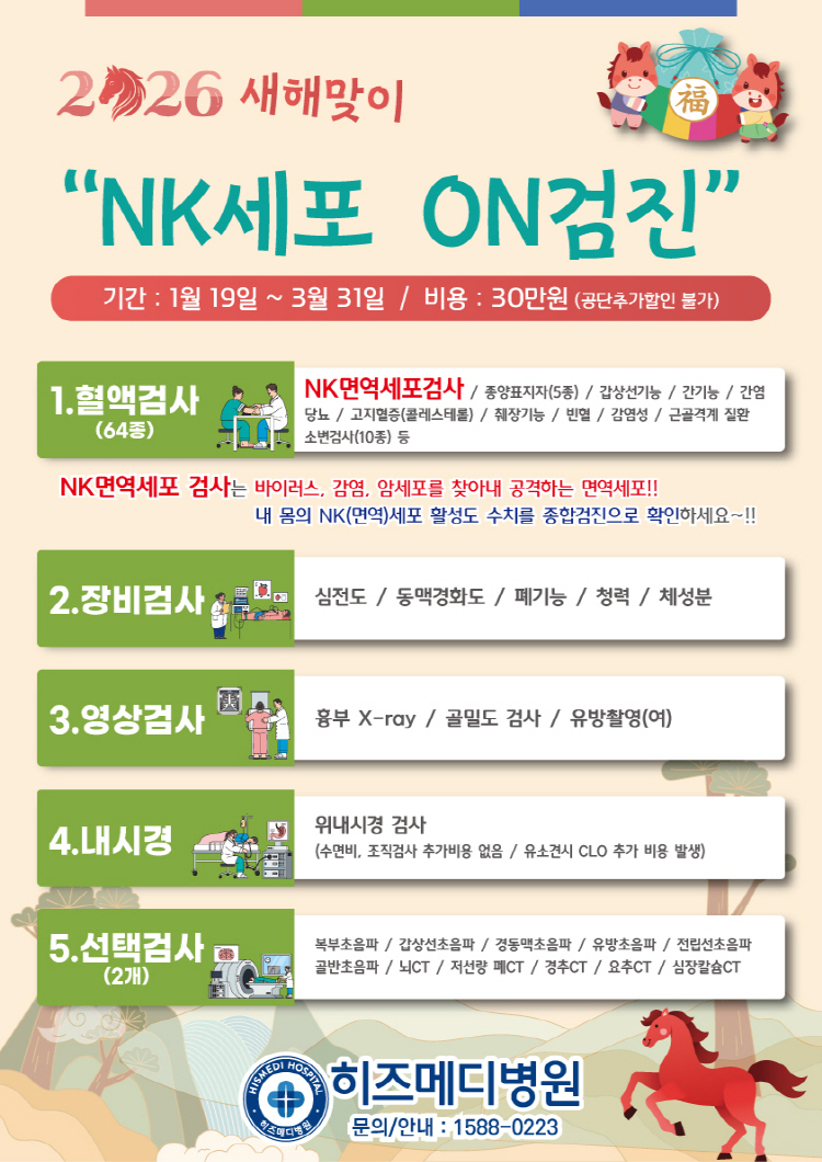 COPYRIGHT © 2018 히즈메디병원. All Rights Reserved.| "NK세포 ON검진" 2026새해맞이 이벤트 |