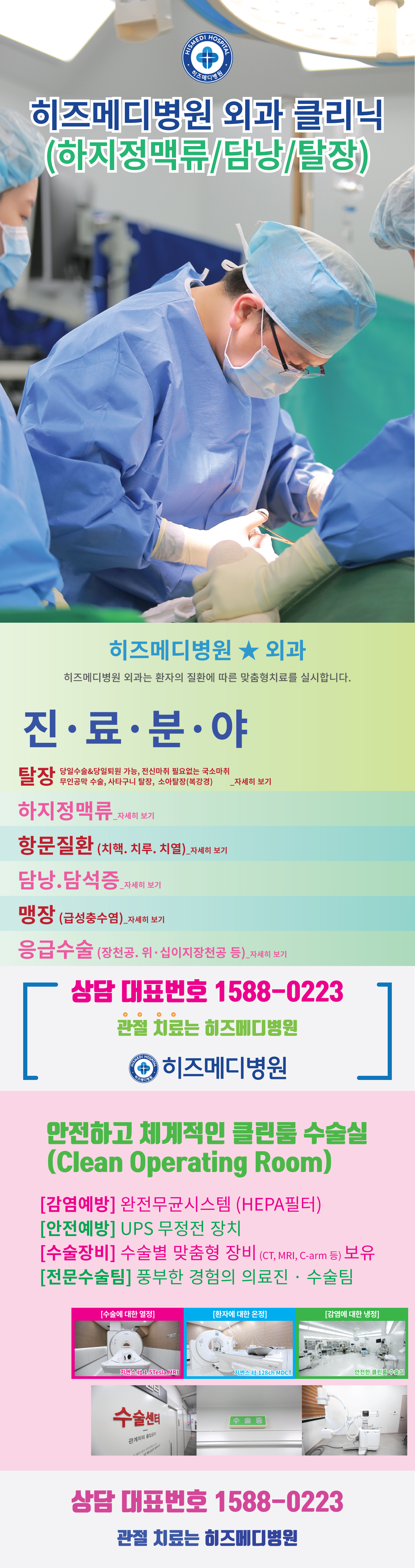 탈장, 유방, 갑상선 조직검사, 급성충수염(맹장), 급성담낭염, 담석증, 하지정맥류, 항문질환, 복강경 소아탈장, 종괴·종양 각종 양성 혹제거, 기타 응급수술 등