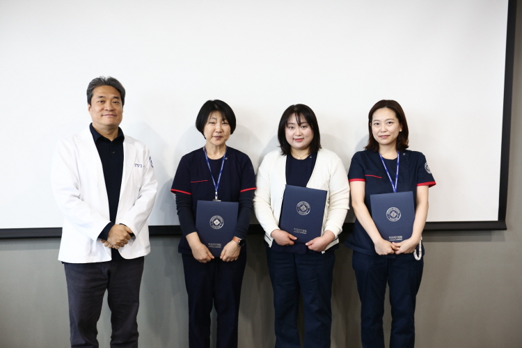 2026년부터 히즈메디병원을 이끌어갈 수간호사 및 책임간호사의 승진 임명식이 있었습니다. ※ 김혜진(7병동 수간호사) ※ 김기정(8병동 수간호사) ※ 김은희(외래 책임간호사) ※ 정선화(주사실 책임간호사)