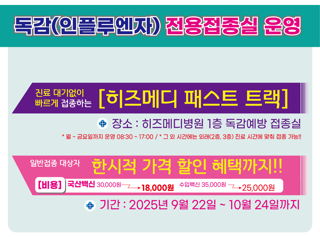 진료 대기없이 빠르게 접종하는 [히즈메디 패스트 트랙] 독감 전용접종실 운영!!
